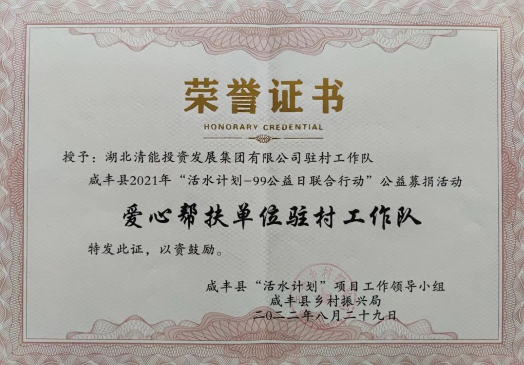 2021年,中国扶贫基金会与咸丰县人民政府联合发起“活水计划——99公益日联合行动”公益募捐活动。活动启动后,集团高度重视,积极响应号召,按照要求迅速组建募捐战队,采取线上线下相结合的捐款方式,助力咸丰的公益事业发展。短短三天时间共计募捐达11.59万元,在咸丰县所有募捐战队中首屈一指,取得了良好的社会反响,为咸丰县巩固拓展脱贫攻坚成果和乡村振兴有效衔接引入了“活水”。