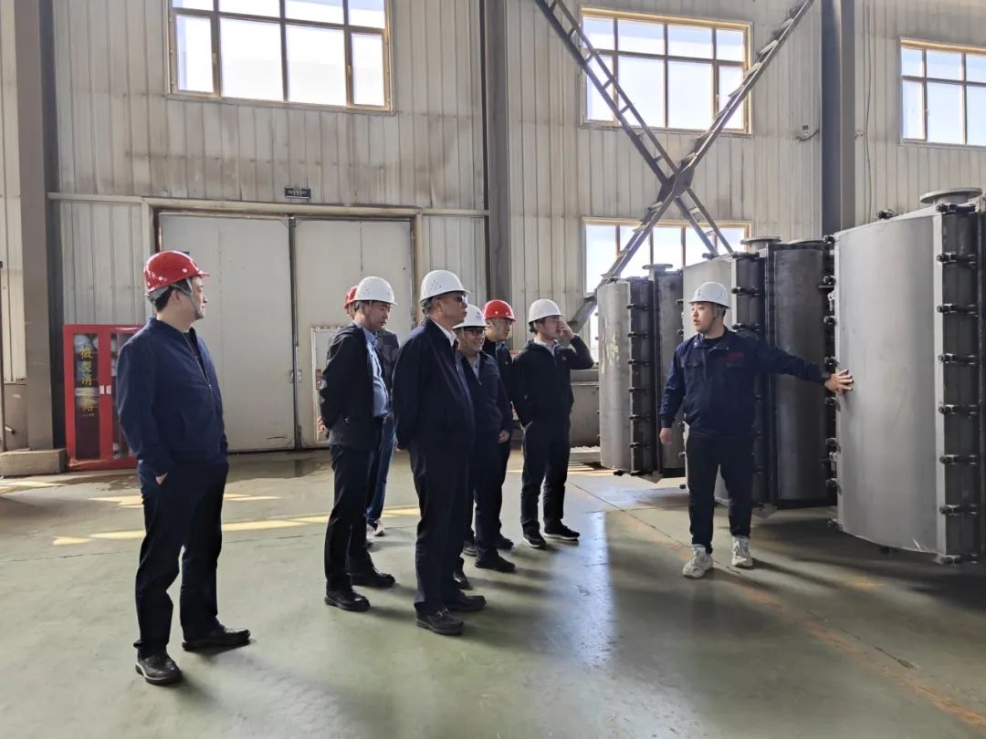 5月15日上午,李红青一行前往金涛科技公司位于双城的装备制造基地,了解该公司的装备制造能力。李红青对金涛科技公司的污水换热器和真空相变闪蒸器进行详细了解,并对可能出现的突发故障及应对手段进行咨询,金涛科技公司技术副总秦爽一一解答。